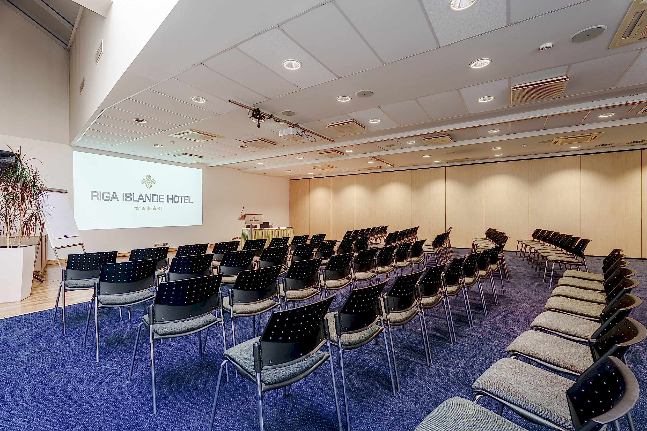 В отеле Riga Islande имеется большой Klondaika площадью 240м2 с общей вместимостью до 200 человек. Помещение трансформируется и разделяется стенами, что делает его уникальным местом для быстрой подготовки к групповым работам.