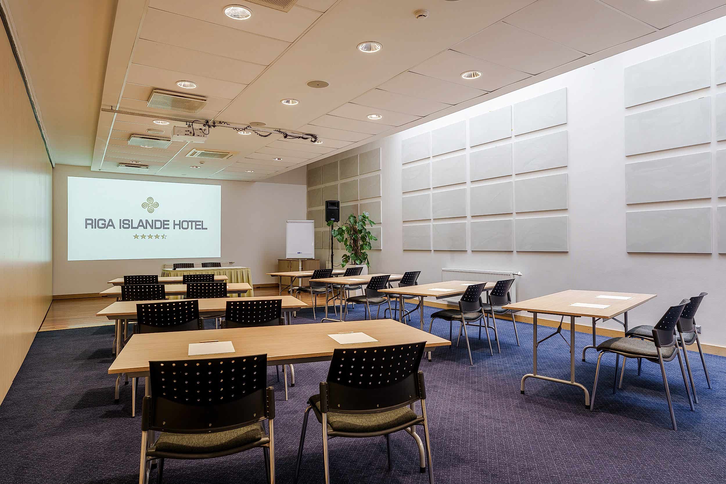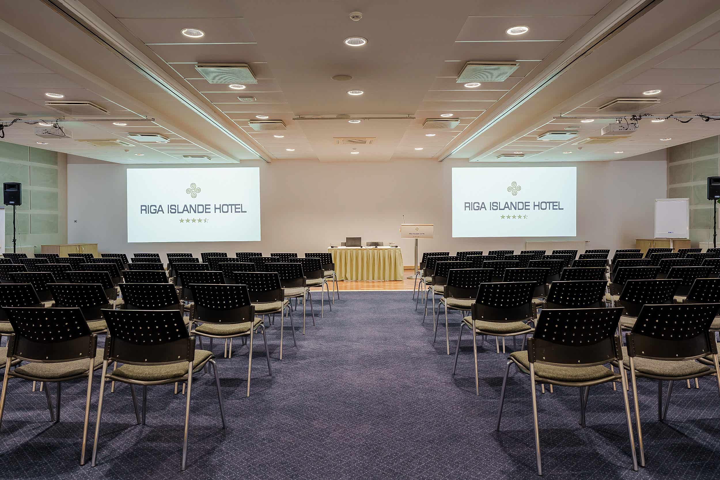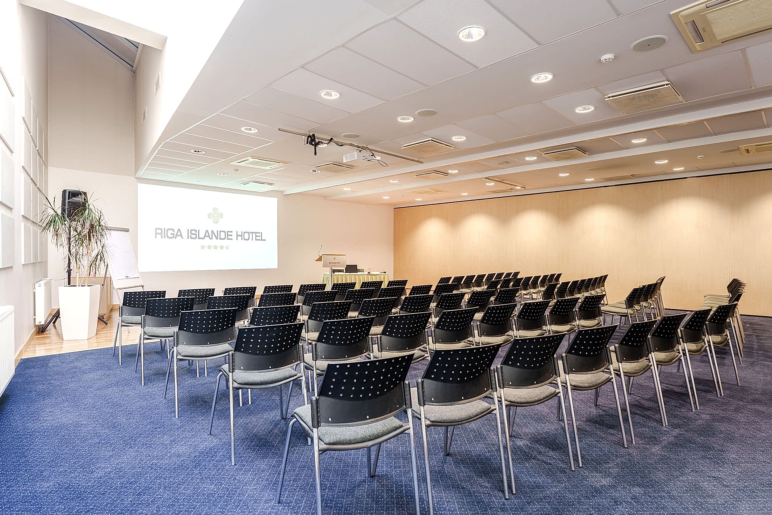 The Riga Islande Hotel has a large 240m2 conference Klondaika with a total capacity of up to 200 people. The room is transformable and dividable by walls making it a unique place to quickly set up for group works.